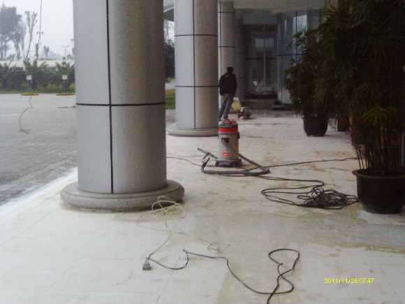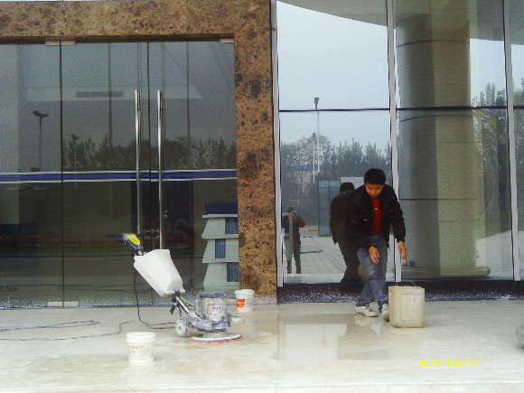 到了70年代末,一種可塑性水溶性結晶聚合物的誕生,亦即是現今常說的水蠟,進化了石材護理的歷史,可以利用這種物質對不同材質的大理石進行護理。分底蠟(封蠟),面蠟(拋光蠟)及保養蠟(日常修補蠟)是對大理石的塑層進行保護并利用高速拋光來增亮,對石材的保護起到一定的作用。但是這種水蠟不足之處是蠟層的硬度有限,稍欠保養,腳步帶進的塵土將很容易把蠟層及石材磨花。同時,遇上雨水季節,因室外雨水塵埃會有一定的雜質,通過人的腳步帶進后,對蠟層的分子組成將造成一定的影響。直觀看到是蠟層變黃及缺光澤,也就是以后常見到的許多客戶為什么須經常將腐蝕的蠟層用起蠟水脫去,再重新分工序打上底蠟和面蠟,每次的工作量及耗用的物料較大,這種工藝現市場上很普通,我們稱為石材打蠟第二代。